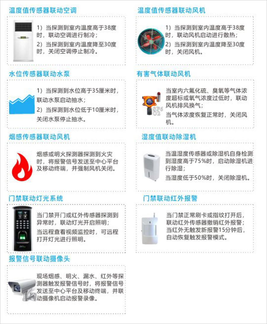 環(huán)境采集傳感器可以接入大華環(huán)境數(shù)據(jù)采集單元,實現(xiàn)環(huán)境數(shù)據(jù)實時采集、展示,包括:溫濕度數(shù)據(jù)、水浸報警、紅外對射報警、電子圍欄報警、紅外雙鑒報警、風速等數(shù)據(jù),實現(xiàn)周界安防監(jiān)控報警、環(huán)境監(jiān)控報警以及智能控制聯(lián)動。