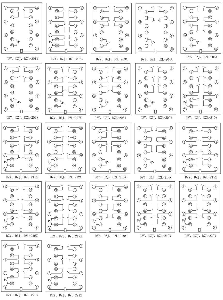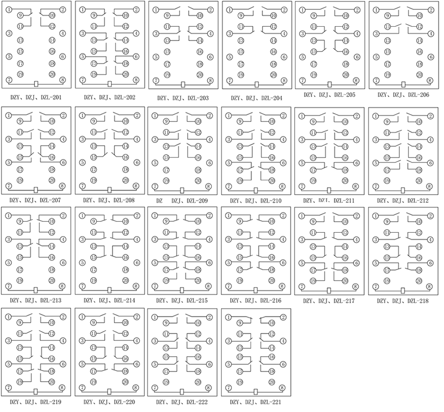 DZY-222中間繼電器用于交直流操作的各種保護和自動控制裝置中,以增加觸點的數量及容量。 中帶"X"的為在"200"基本型基礎上增加一副帶機械保持的動合信號觸點并帶有動作信號指示器。DZY為直流電壓型中間繼電器,DZL為直流電流型中間繼電器,DZJ為交流型中間繼電器。